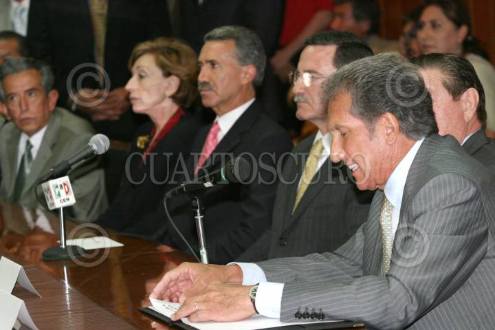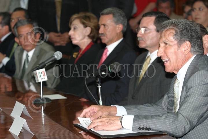 MEXICO, DF 20OCTUBRE2005.- Arturo Montiel, ahora ex precandidato a la candidatura presidencial priísta, durante el momento que anunció su dimisión a los medios de comunicación. Lo observan Everardo Moreno, Rosario Green, Roberto Madrazo, Mariano Palacios. FOTO: Miguel Dimayuga/CUARTOSCURO.COM