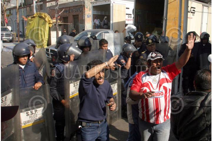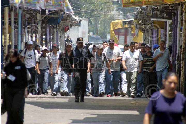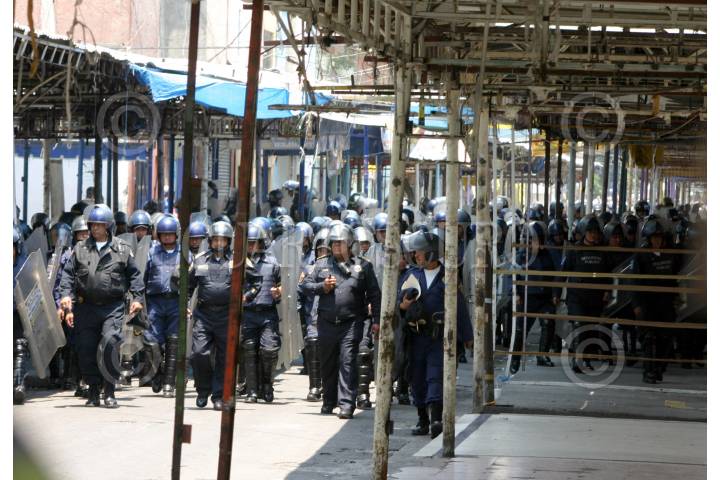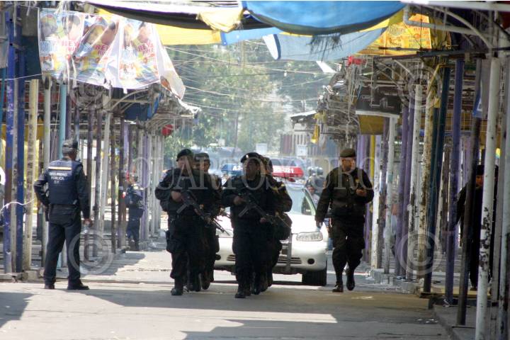 MÉXICO D.F., 22ABRIL2008.- Policias granaderos cerraron varias calles en el barrio de tepito durante el operativo de la PGR para decomisar mas de 100 toneladas de perfumes que ingresaron al país de contrabando. FOTO: PEDRO MARRUFO/CUARTOSCURO.COM