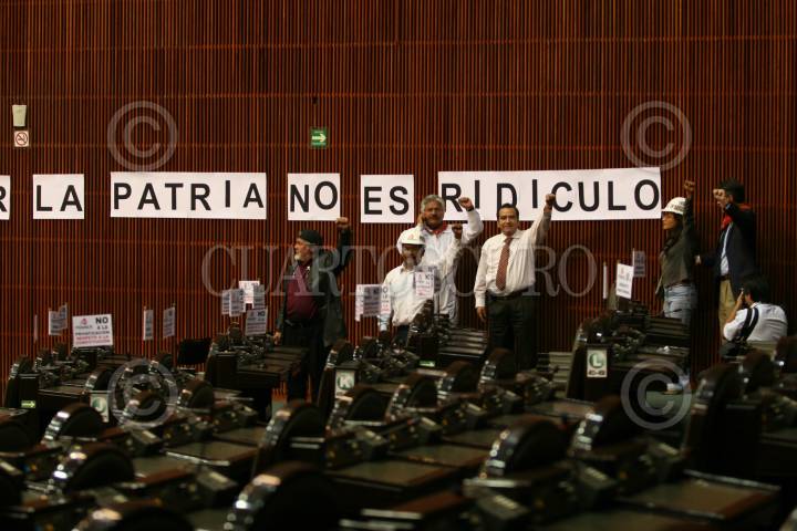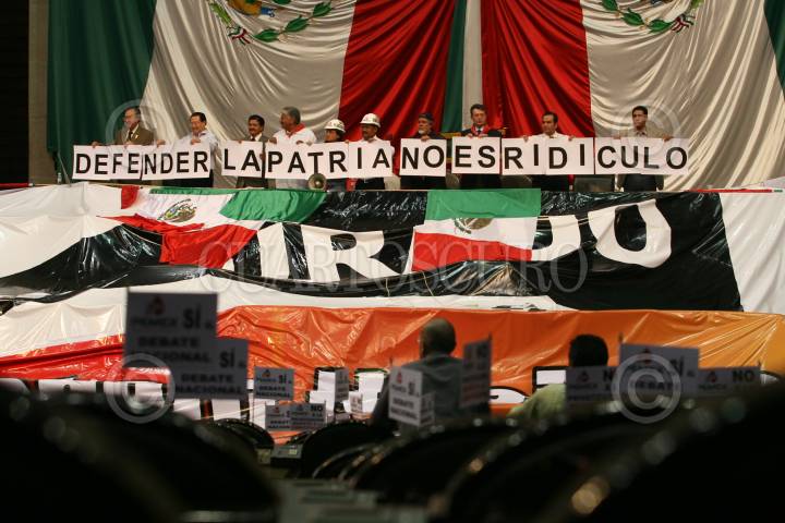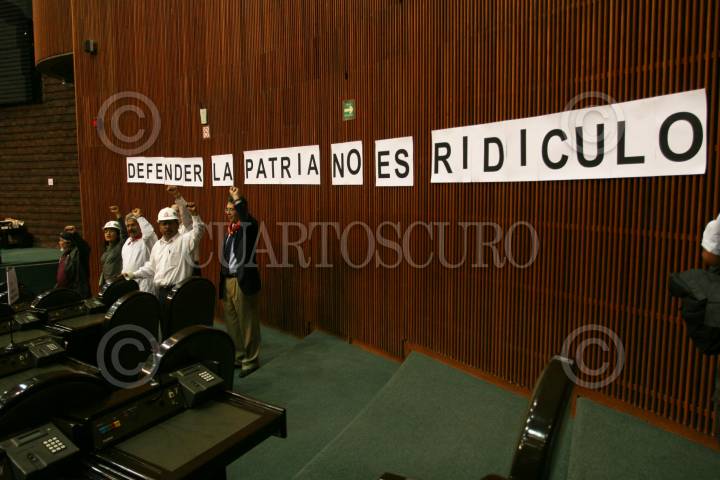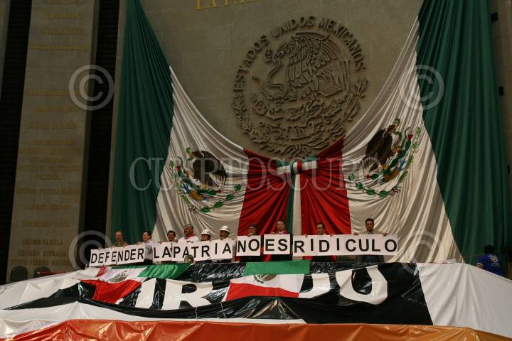 MÉXICO D.F. 23ABRIL2008.-Diputados integrantes del FAP, colocaron como frase del día en el salón de plenos de la Cámara de Diputados la leyenda "Defender la Patria no es Ridículo" esto como respuesta a lo comentado el día de ayer por el presidente Felipe Calderón. FOTO: GUILLERMO PEREA /CUARTOSCURO.COM