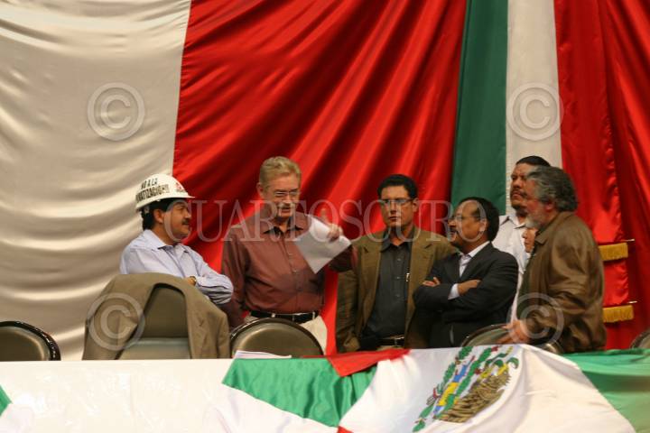MÉXICO D.F. 14ABRIL2008.-Diputados integrantes de la FAP realizan la frase del día con la leyenda "Defender la Constitución no tiene Precio".esto en salón de plenos que mantienen tomado desde hace 15n días.En la imagen el diputado Javier González Garza dialoga con diputados en la tribuna FOTO: GUILLERMO PEREA /CUARTOSCURO.COM