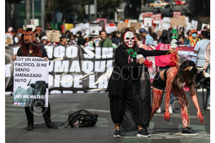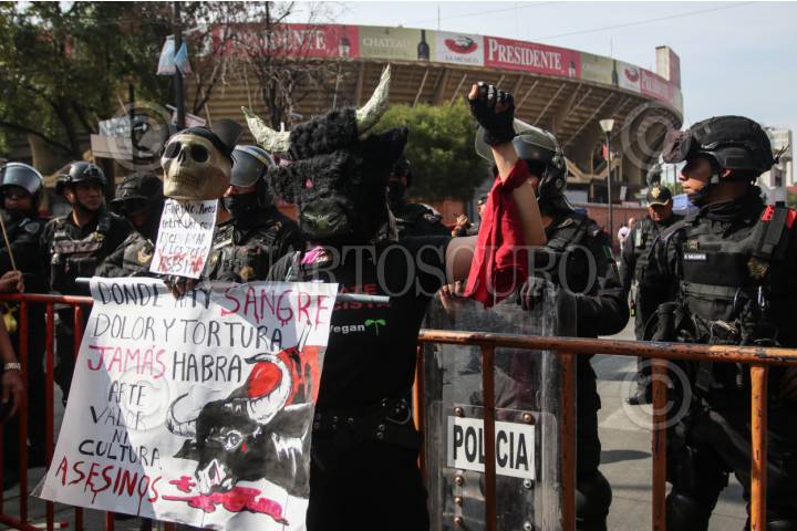CIUDAD DE MÉXICO, 28ENERO2023.- Decenas de personas en defensa de los derechos por los animales marcharon desde glorieta de los insurgentes hasta la plaza de toros para exigir que se vuelvan a prohibir las corridas. Durante la marcha trataron de abrir la puerta principal y agredieron a personas que se disponían a entrar a la plaza. FOTO: ANDREA MURCIA /CUARTOSCURO.COM