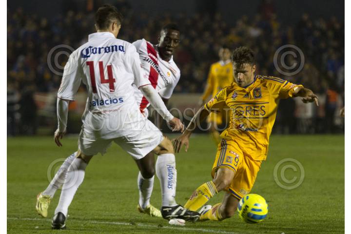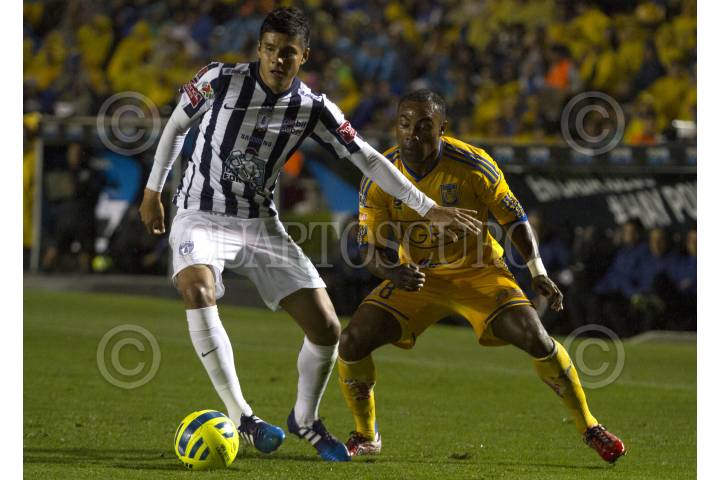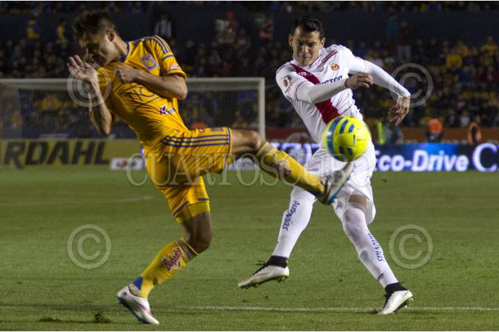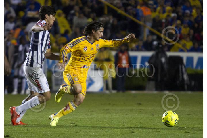 SAN NICOLÁS DE LOS GARZA, NUEVO LEÓN, 14FEBRERO2015.- Enrique Esqueda del equipo de los Tigres de la UANL se disputa el balón contra Carlos Calvo del equipo de los Monarcas de Morelia, en el estadio Universitario, partido correspondiente a la jornada 6 de la Liga MX, Clausura 2015. FOTO: GABRIELA PÉREZ MONTIEL / CUARTOSCURO.COM