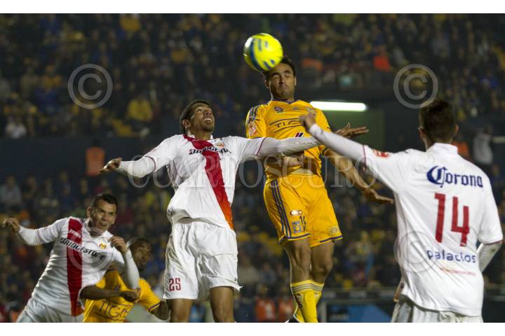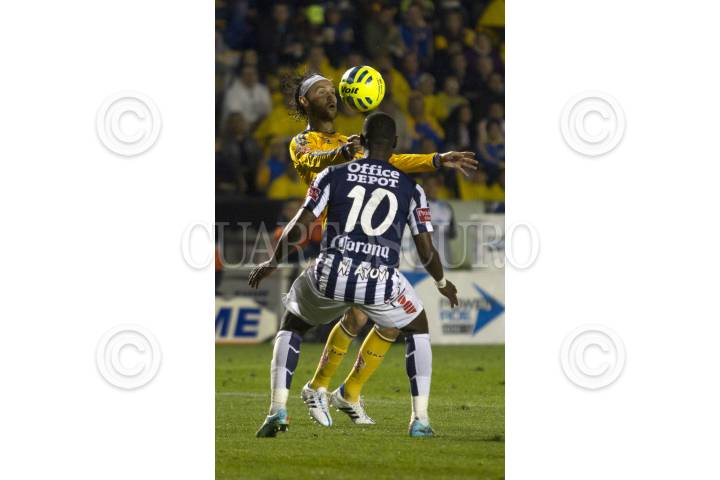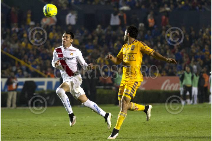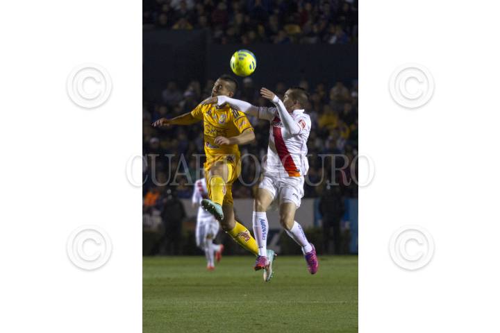 SAN NICOLÁS DE LOS GARZA, NUEVO LEÓN, 14FEBRERO2015.- Jorge Torres del equipo de los Tigres de la UANL se disputa el balón contra Daniel Arreola del equipo de los Monarcas de Morelia, en el estadio Universitario, partido correspondiente a la jornada 6 de la Liga MX, Clausura 2015. FOTO: GABRIELA PÉREZ MONTIEL / CUARTOSCURO.COM