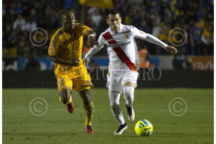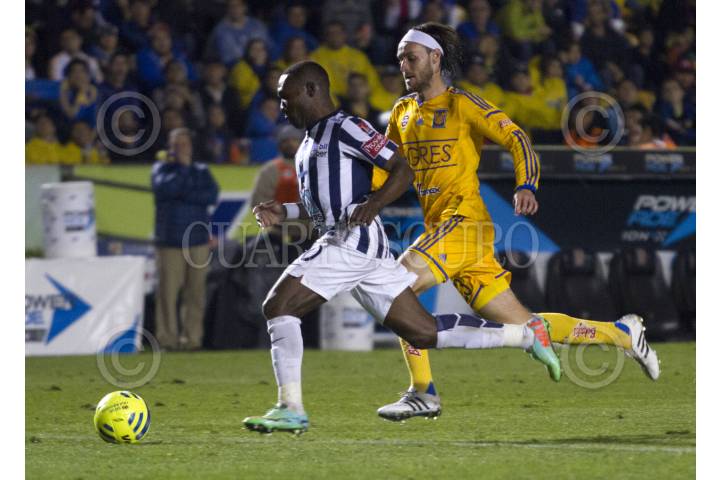 SAN NICOLÁS DE LOS GARZA, NUEVO LEÓN, 14FEBRERO2015.- Joffre Guerrón del equipo de los Tigres de la UANL se disputa el balón contra Daniel Arreola del equipo de los Monarcas de Morelia, en el estadio Universitario, partido correspondiente a la jornada 6 de la Liga MX, Clausura 2015. FOTO: GABRIELA PÉREZ MONTIEL / CUARTOSCURO.COM