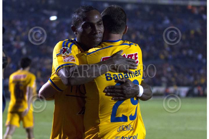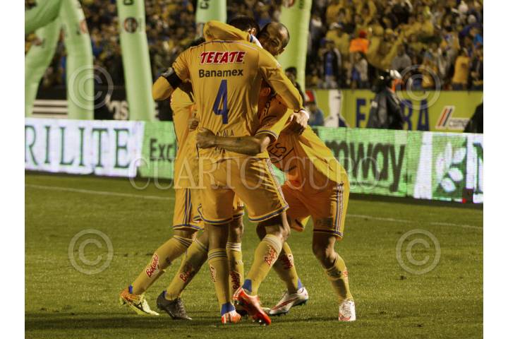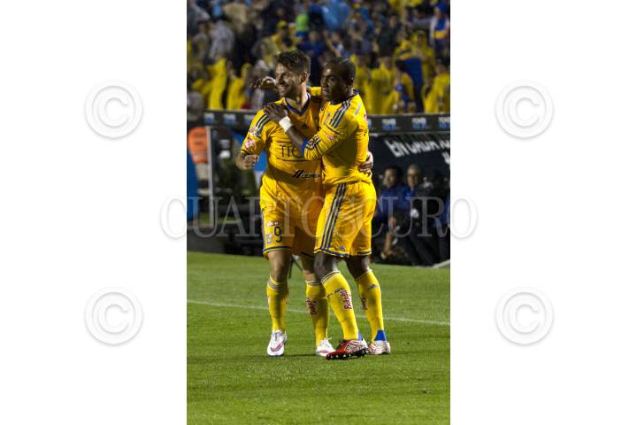 SAN NICOLÁS DE LOS GARZA, NUEVO LEÓN, 14MARZO2015.- Jugadores del equipo de los Tigres de la UANL celebran el primer gol durante el primer tiempo contra el equipo de los Tuzos del Pachuca, en el estadio Universitario, partido correspondiente a la jornada 10 de la Liga MX, Clausura 2015. FOTO: GABRIELA PÉREZ MONTIEL / CUARTOSCURO.COM