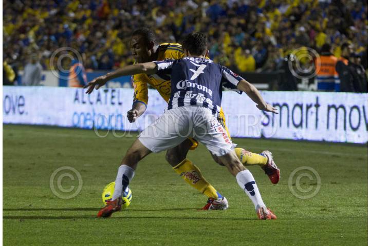 SAN NICOLÁS DE LOS GARZA, NUEVO LEÓN, 14MARZO2015.- Joffre Guerrón del equipo de los Tigres de la UANL se disputa el balón contra Rodolfo Pizarro del equipo de los Tuzos del Pachuca, en el estadio Universitario, partido correspondiente a la jornada 10 de la Liga MX, Clausura 2015. FOTO: GABRIELA PÉREZ MONTIEL / CUARTOSCURO.COM