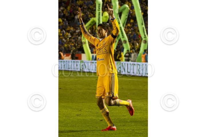 SAN NICOLÁS DE LOS GARZA, NUEVO LEÓN, 14MARZO2015.- Hugo Ayala del equipo de los Tigres de la UANL celebra el segundo gol contra equipo de los Tuzos del Pachuca, en el estadio Universitario, partido correspondiente a la jornada 10 de la Liga MX, Clausura 2015. FOTO: GABRIELA PÉREZ MONTIEL / CUARTOSCURO.COM