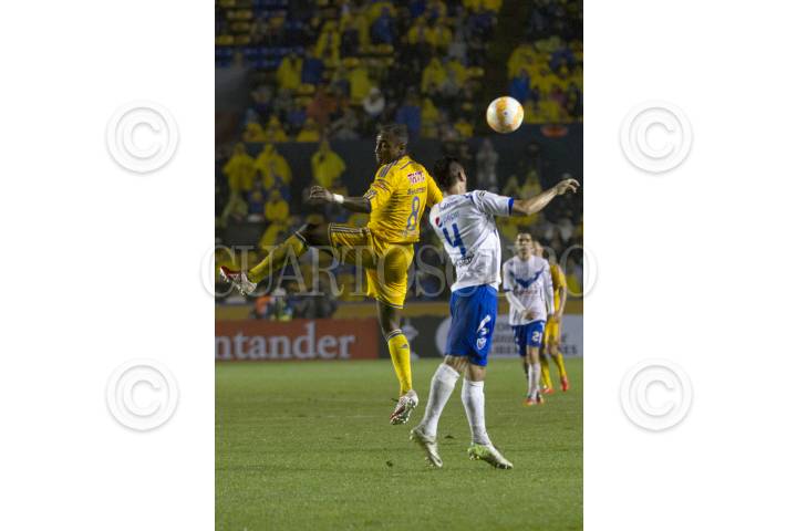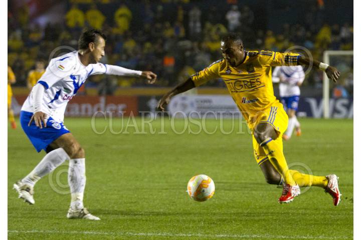 SAN NICOLÁS DE LOS GARZA, NUEVO LEÓN, 17MARZO2015.- Joffre Guerrón del equipo de los Tigres de la UANL se disputa el balón contra Arnoldo Vera el equipo de San José Oruro, en el estadio Universitario, partido correspondiente a fase de grupos de la Copa Libertadores 2015. FOTO: GABRIELA PÉREZ MONTIEL / CUARTOSCURO.COM