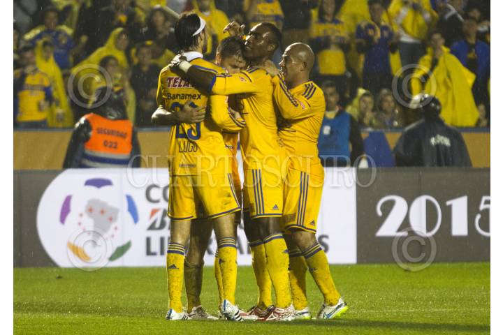 SAN NICOLÁS DE LOS GARZA, NUEVO LEÓN, 17MARZO2015.- Jugadores del equipo de los Tigres de la UANL celebran el segundo gol contra el equipo de San José Oruro, en el estadio Universitario, partido correspondiente a fase de grupos de la Copa Libertadores 2015. FOTO: GABRIELA PÉREZ MONTIEL / CUARTOSCURO.COM