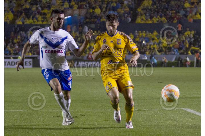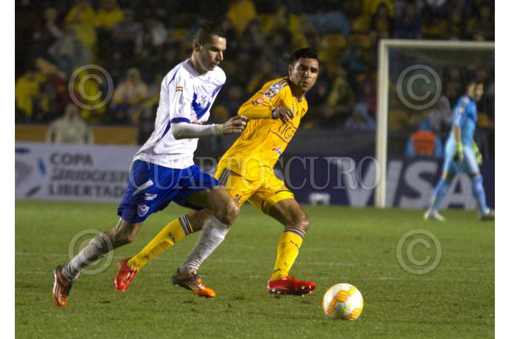 SAN NICOLÁS DE LOS GARZA, NUEVO LEÓN, 17MARZO2015.- José Rivas del equipo de los Tigres de la UANL se disputa el balón contra Leandro Ferreira el equipo de San José Oruro, en el estadio Universitario, partido correspondiente a fase de grupos de la Copa Libertadores 2015. FOTO: GABRIELA PÉREZ MONTIEL / CUARTOSCURO.COM