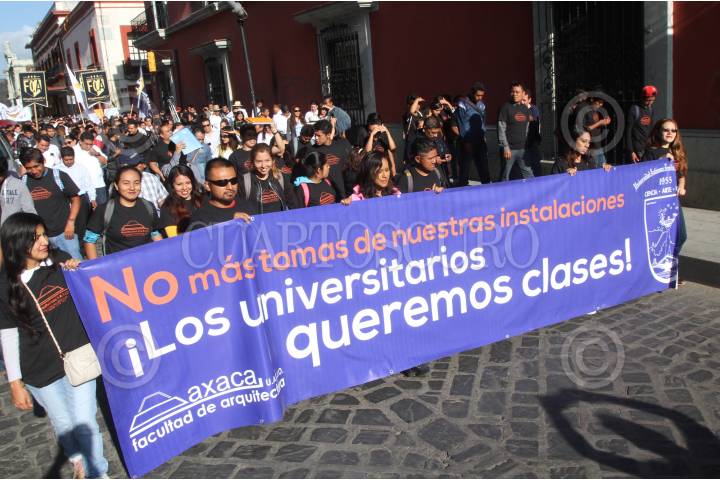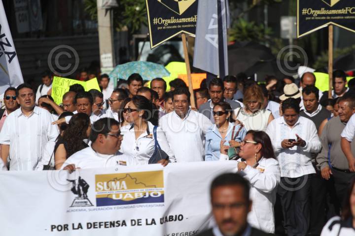 OAXACA, OAXACA., 04OCTUBRE2016.- Catedráticos y estudiantes pertenecientes a la Universidad Autónoma Benito Juárez de Oaxaca (UABJO) marcharon a la Defensoría de los Derechos de los Pueblos de Oaxaca encabezados por el rector, Eduardo Bautista para presentar una queja por la toma de las instalaciones de Ciudad Universitaria, que cumplió tres semanas por parte de integrantes del Sindicato de Trabajadores Académicos (Stauo). FOTO: ARTURO PÉREZ ALFONSO /CUARTOSCURO.COM