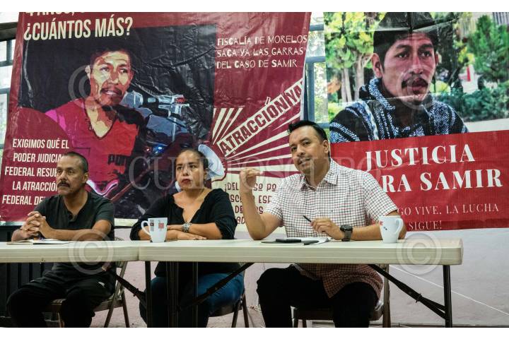 Carlos González, Samantha César Vargas y David Peña durante la conferencia de prensa con motivo del caso del asesinato del comunicador y activista Samir Flores en las inmediaciones de la organización SERAPAZ.