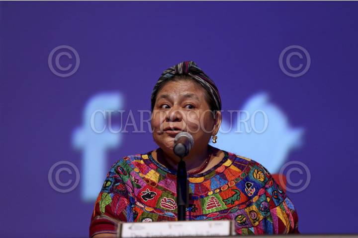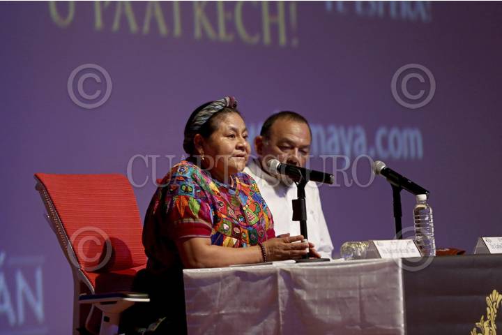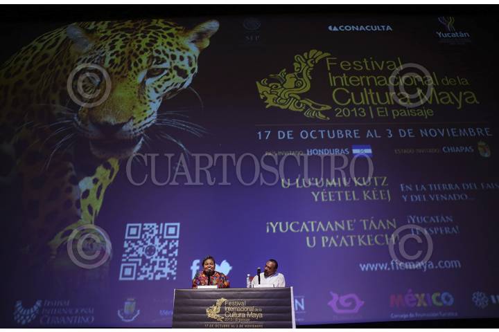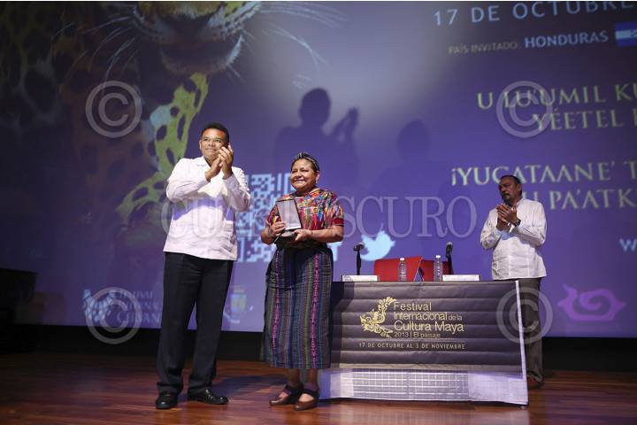 MÉRIDA, YUCATÁN, 21OCTUBRE2013.- En el marco del Festival Internacional de la Cultura Maya (FICMaya) 2013, el Gobernador Rolando Zapata Bello entregó la presea a la indígena guatemalteca, Rigoberta Menchú Tum quien por su labor como luchadora social y defensora de los derechos de esta civilización ha recibido el Premio Nobel de la Paz 1992, y hoy se convirtió en la primera persona en recibir la medalla “Yuri Knórozov”, distinción que reconoce a las mujeres y hombres del Mundo Maya o de cualquier otra parte del orbe que participan con su voz, experiencia de vida, principios y saberes tradicionales en el debate internacional sobre este tema. FOTOS: FRANCISCO BALDERAS /CUARTOSCURO.COM