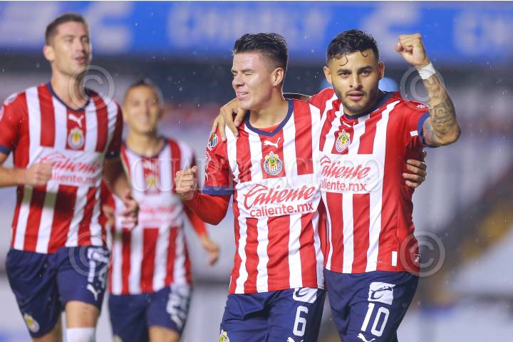 Pavel Pérez y Alexis Vega (Chivas) celebran uno de los dos goles que anotó su equipo en el partido ante el Querétaro.