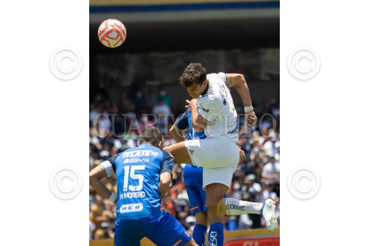 Juan Ignacio Dinenno (Pumas) remata un balón en el área chica del Monterrey, en partido empatado a un gol.