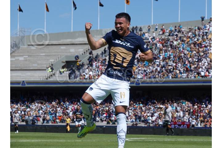 CIUDAD DE MÉXICO, 11FEBRERO2024.- Ali Ávila, delantero de Pumas, celebró un gol con marcador final 3-0 favor Pumas contra Puebla en la Clausura 2024 Jornada 6 de la Liga MX en el Estadio Olímpico Universitario. FOTO: GRACIELA LÓPEZ/ CUARTOSCURO.COM