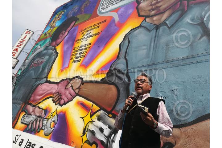 CIUDAD DE MÉXICO, 01NOVIEMBRE2017.- El Consejo de la Comunicación y la delegación Cuauhtémoc inauguraron el mural "Pepe y Toño y Ana y Mary", en honor a todos los empresarios emprendedores de la delegación. La obra está sobre el muro de una refaccionaría, ubicada en Calzada de Guadalupe 8, en la colonia ex Hipódromo de Peralvillo. En la imagen el cronista Alfonso Hernández explica el mural. FOTO: MOISÉS PABLO /CUARTOSCURO.COM