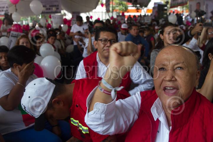 CIUDAD DE MÉXICO, 20MAYO2018.- Felipe Tibio Muñoz, Alejandra Barrios, y Leticia Quezadam durante un mitin de Mikel Arriola, candidato a la Jefatura de Gobierno por el PRI, con militantes de la delegaciñon Cuauhtémoc, en la explanada del Jadín Lázaro Cárdenas. FOTO: MOISÉS PABLO /CUARTOSCURO.COM