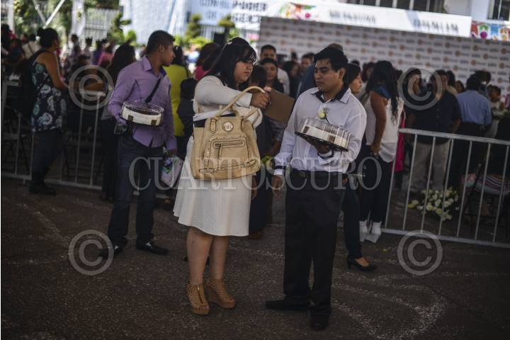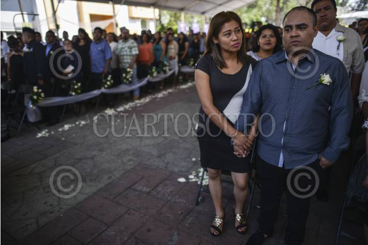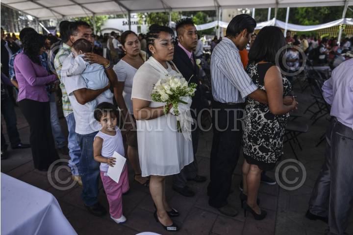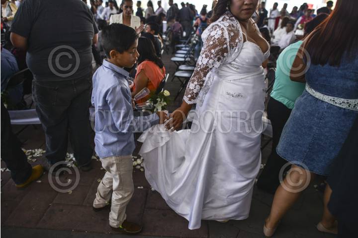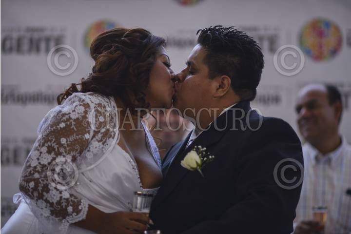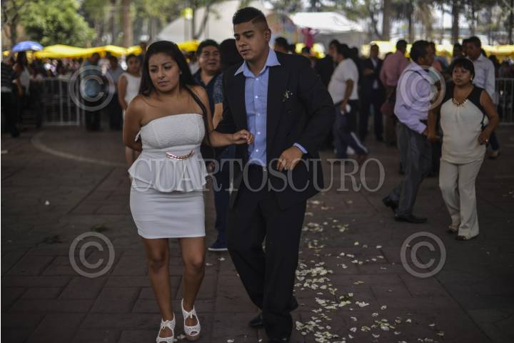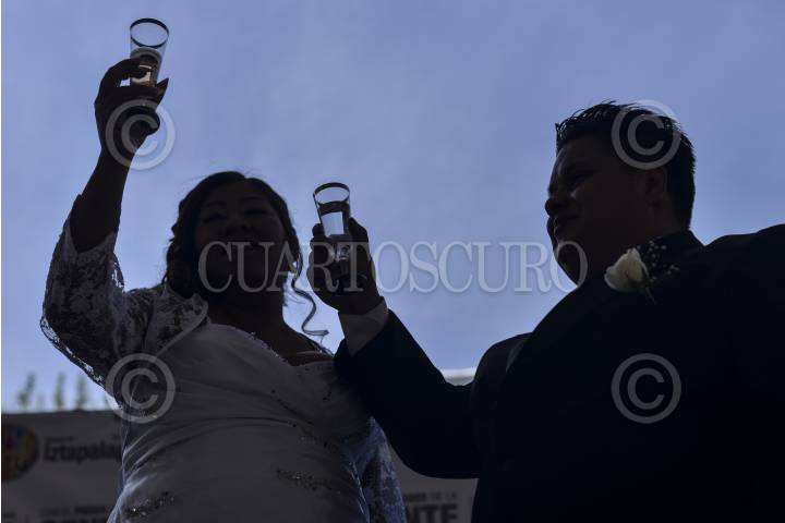 CIUDAD DE MÉXICO, 06MAYO2016.- Cien parejas contrajeron matrimonio como parte de las bodas colectivas que autoridades de la delegación Iztapalapa realizaron en la explanada delegacional. La delegación condonó el costo del tramite y obsequió la primera copia certificada del acta que da validez a la unión civil. FOTO: ADOLFO VLADIMIR /CUARTOSCURO.COM