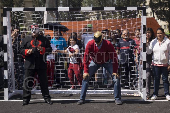 MÉXICO, DF., 09ABRIL2014.- Los luchadores Octagon y Tinieblas asistieron a la inauguración de las instalaciones deportivas. Mauricio Toledo, jefe delegacional de Coyoacán, inauguró el Polideportivo dentro de las instalaciones del deportivo Francisco Mujica , ubicado entre los límites de la delegación Iztapalapa y el pueblo de Culhuacán. Actividades de contacto como tae kwon do, lima lama, muay thai, box, karate y esgrima compartirán el espacio dentro del polideportivo. Un anexo destinado para deportes en equipo como voleibol y basquetbol, fue remodelado también. Otras instalaciones que forman parte son la alberca techada, la cancha de futbol rápido y las áreas libres. El período de remodelación tuvo una duración de 7 meses. El delegado mencionó que este un primer proyecto al que se sumarán después la construcción de tres polideportivos más en la zona de Santa Úrsula, Taxqueña y Ruiz Cortines. FOTO: MARÍA JOSÉ MARTÍNEZ /CUARTOSCURO.COM