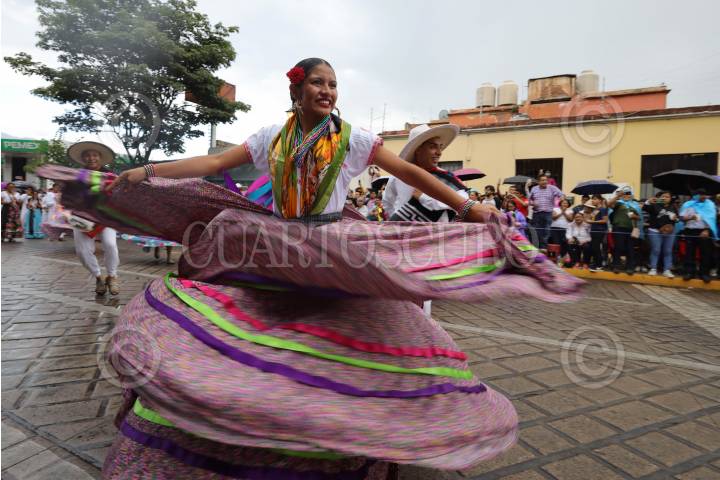OAXACA, OAXACA, 27JULIO2024.- A pesar de la lluvia, delegaciones participantes de la Octava del Lunes del Cerro participaron en un desfile por la principales calles de la ciudad de Oaxaca. Miles de personas disfrutaron de la música, el colorido, las tradiciones y cultura de los 16 pueblos originarios y el afromexicano, representados en 30 delegaciones que el próximo lunes 29 de julio participarán en el auditorio Guelaguetza. FOTO: CAROLINA JIMÉNEZ/CUARTOSCURO.COM