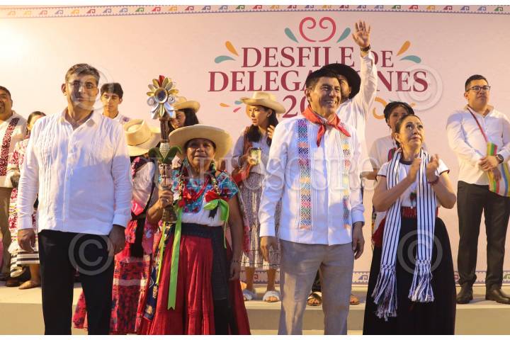 OAXACA, OAXACA, 27JULIO2024.- Salomón Jara, gobernador de Oaxaca, y su esposa Irma Bolaños, disfrutaron del desfile de las delegaciones participantes en la Guelaguetza. Miles de personas disfrutaron de la música, el colorido, las tradiciones y cultura de los 16 pueblos originarios y el afromexicano, representados en 30 delegaciones que el próximo lunes 29 de julio participarán en el auditorio Guelaguetza. FOTO: CAROLINA JIMÉNEZ/CUARTOSCURO.COM