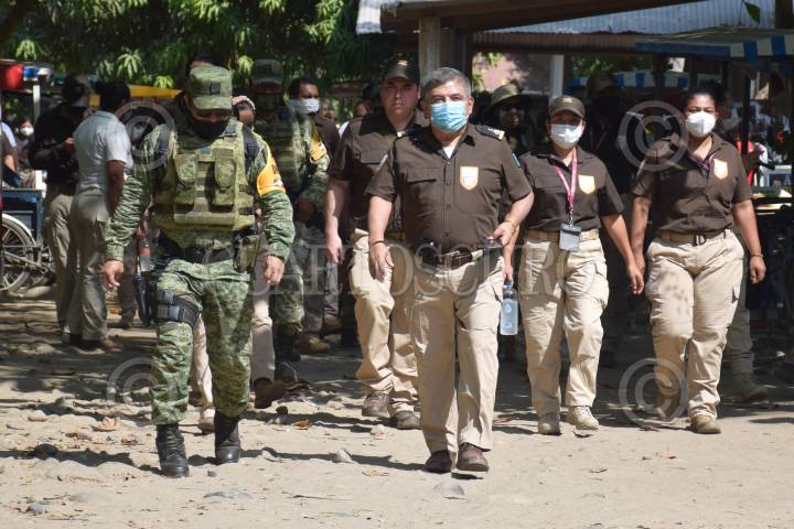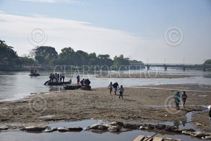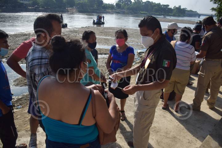 Elementos del la Guardia Nacional y del Instituto Nacional de Migración mantiene cerco en los límites del Río Suchiate.