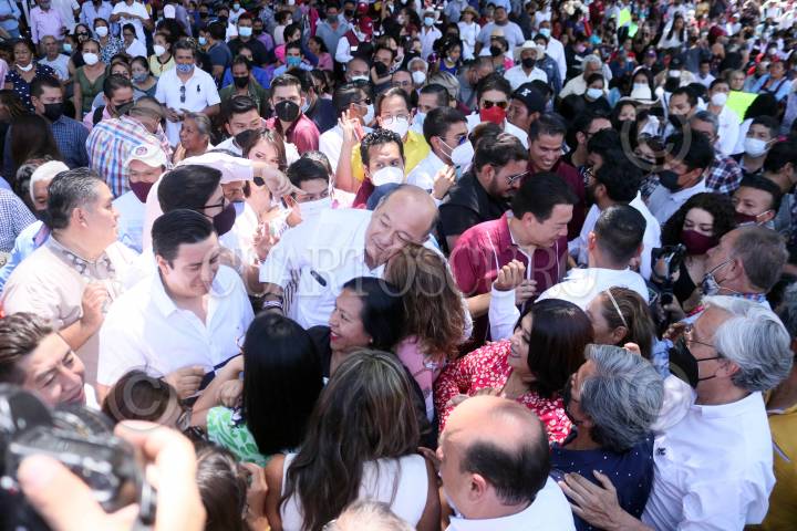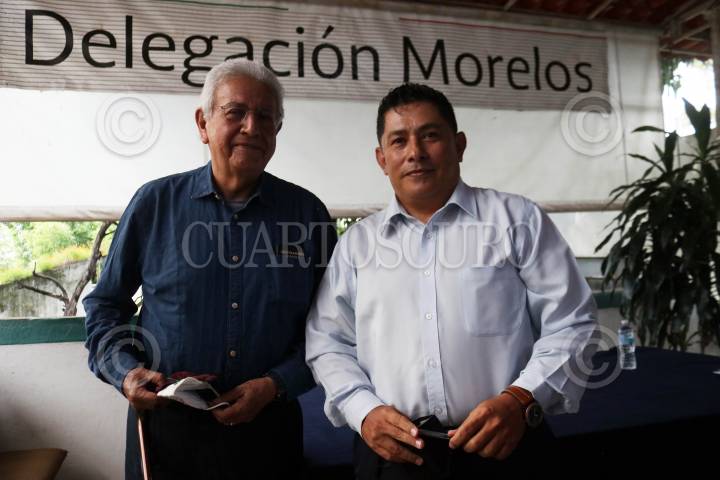 Cesar Ojeda Zubieta y Mario Delgado Carrillo al final de la toma de protesta de comites de defensa de la 4T en Cuautla, Morelos.