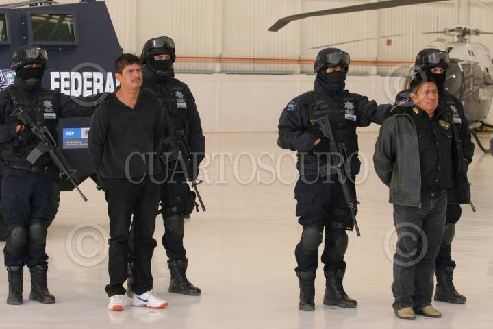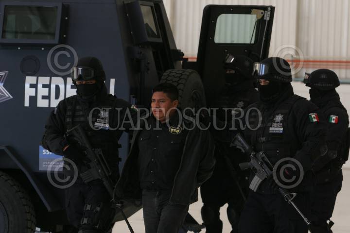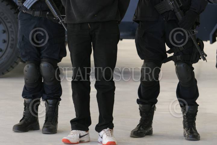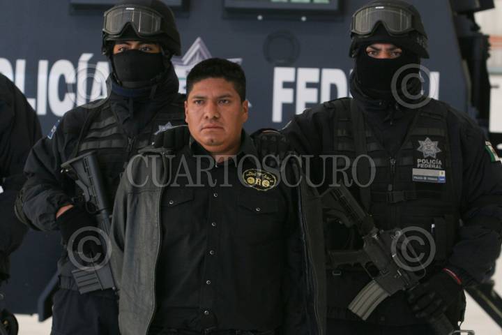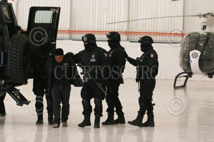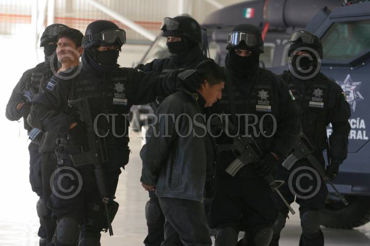 MÉXICO, D.F., 18ENERO2011.- Elementos de la Policía Federal, presentaron ante los medios de comunicación a Flavio Mendez Santiago, alias "El Amarillo", uno de los fundadores de la organización delictiva conocida como "Los Zetas" y buscado por en la lista de los 37 lideres criminales más peligrosos de México, junto con el "Amarillo" fue detenido Carlos Alejandro Rodríguez Zepeda, quien actuaba como escolta personal de Méndez Santiago. FOTO: SAÚL LÓPEZ/CUARTOSCURO.COM