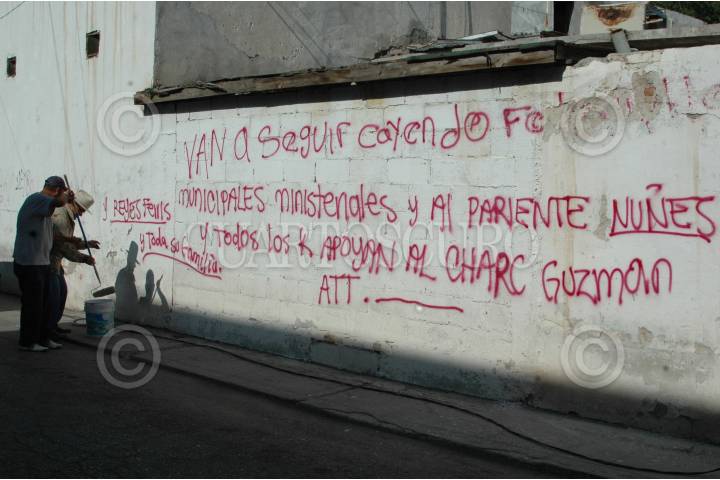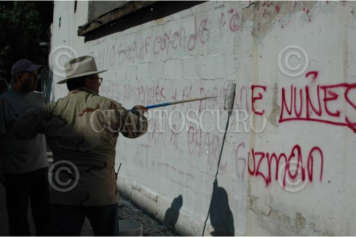 CIUDAD JUÁREZ, CHIHUAHUA, 01JULIO2010.- En una pared blanca de las calles Honduras y Vicente Guerrero un grupo delictivo dejó un mensaje en contra de todas aquellas autoridades que supuestamente están apoyando a "El Chapo". Fue esta mañana cuando se localizó la narcopinta que textualmente cita: "Van a seguir cayendo federales, municipales, ministeriales y al Pariente Núñez y todos los que apoyan al Chapo Guzmán y Reyes Ferriz y toda su familia". FOTO: IGNACIO RUIZ/CUARTOSCURO.COM