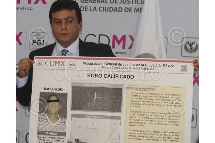 CIUDAD DE MÉXICO, 08DICIEMBRE2016.- Víctor Manuel Castro Martínez, fiscal desconcentrado de investigación en Iztapalapa, ofreció una conferencia de prensa para hablar sobre el caso en donde un policía abatió a un asaltante que intentaba despojar a pasajeros del transporte público, preceisando que el occiso intento herir al oficial con una arma blanca. FOTO: ARMANDO MONROY /CUARTOSCURO.COM