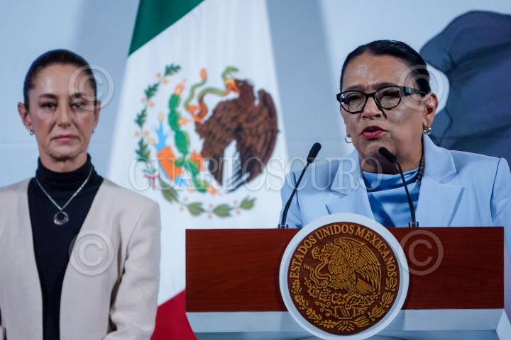 CIUDAD DE MÉXICO, 11MARZO2025.- Claudia Sheinbaum, presidenta de México, y Rosa Icela Rodríguez, secretaria de Gobernación, durante la conferencia “Mañanera del Pueblo” en la que se presentó el informe en materia de seguridad. FOTO: GALO CAÑAS/CUARTOSCURO.COM