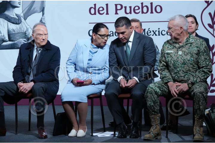 CIUDAD DE MÉXICO, 11MARZO2025.- Alejandro Gertz Manero, Fiscal General de la República; Rosa Icela Rodríguez, secretaria de Gobernación; Omar García Harfuch, secretario de Seguridad Pública y Protección Ciudadana, y Ricardo Trevilla Trejo, secretario de la Defensa Nacional, durante la conferencia “Mañanera del Pueblo” en la que se presentó el informe en materia de seguridad. FOTO: GALO CAÑAS/CUARTOSCURO.COM