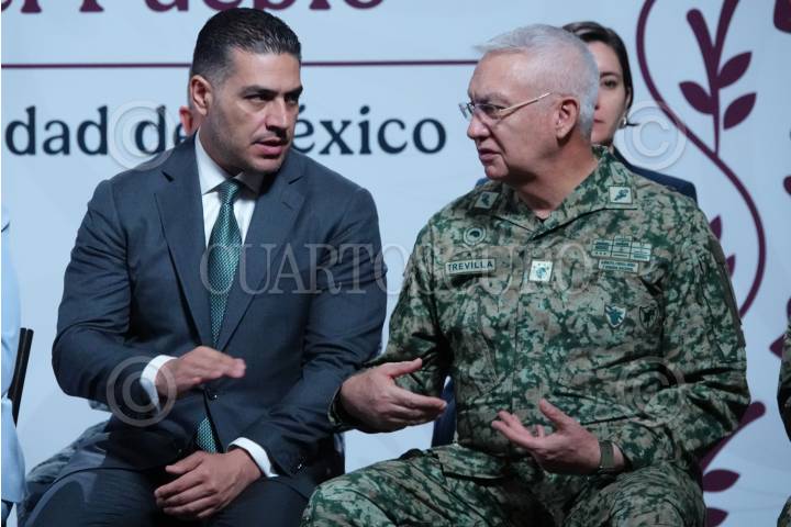 CIUDAD DE MÉXICO, 11MARZO2025.- Omar García Harfuch, secretario de Seguridad Pública y Protección Ciudadana, y Ricardo Trevilla Trejo, secretario de la Defensa Nacional, durante la conferencia “Mañanera del Pueblo” en la que se presentó el informe en materia de seguridad. FOTO: GALO CAÑAS/CUARTOSCURO.COM