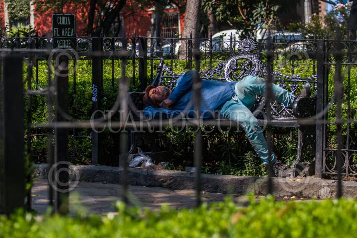 CIUDAD DE MÉXICO, 27NOVIEMBRE2018.- Un indigente toma un descanso en una banca en la colonia San Ángel, al sur de la ciudad. FOTO: ISAAC ESQUIVEL /CUARTOSCURO.COM