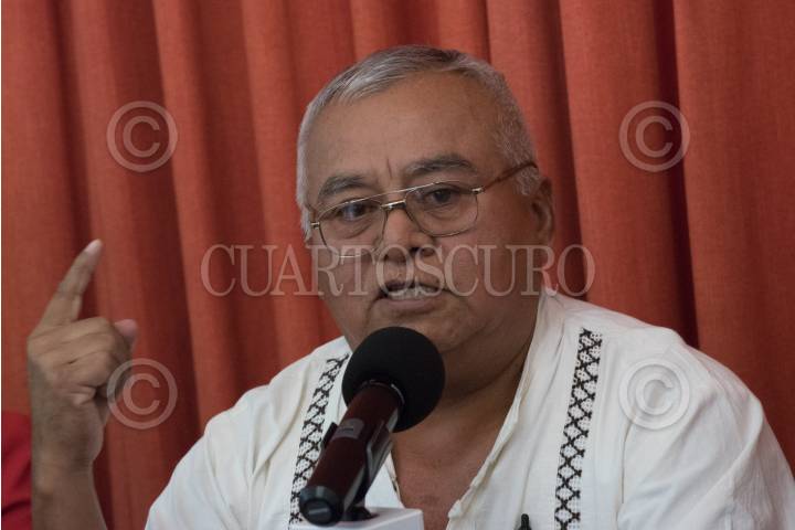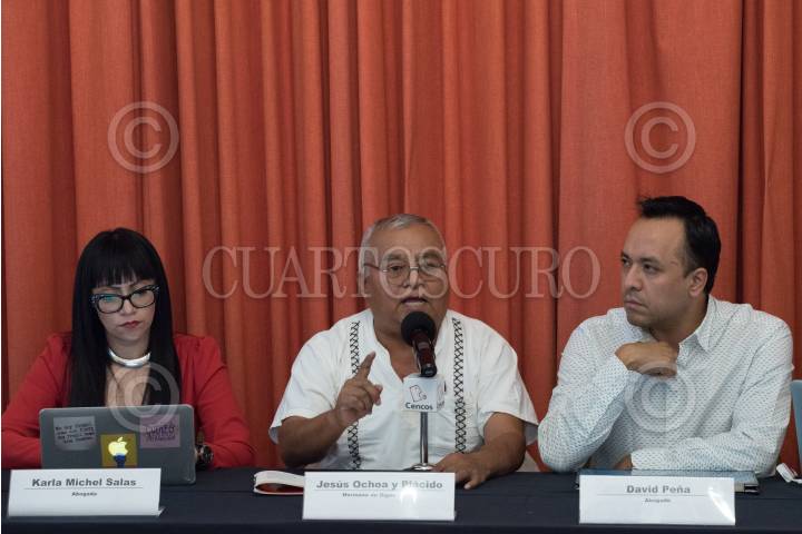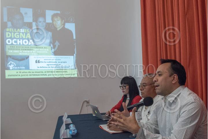 Karla Michel Salas, abogada; Jesús Ochoa y Plácido, hermano de Digna Ochoa, y David Peña, abogado, durante conferencia de prensa para presentar avances sobre la demanda en contra el Estado Mexicano, en la que se busca la reapertura del caso de la defensora de derechos humanos Digna Ochoa.