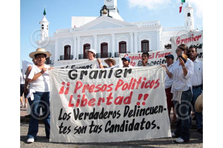 VILLAHERMOSA, TABASCO, 01SEPTIEMBRE2009.- Manifestantes del PRD se plantan en un mitin en los alrededores del Palacio de Gobierno, en donde lanzan consignas altisonantes al gobernador Andrés Granier Melo, con sus pancartas con distintas leyendas. FOTO: MARCO POLO GUZMÁN HERNÁNDEZ/CUARTOSCURO.COM