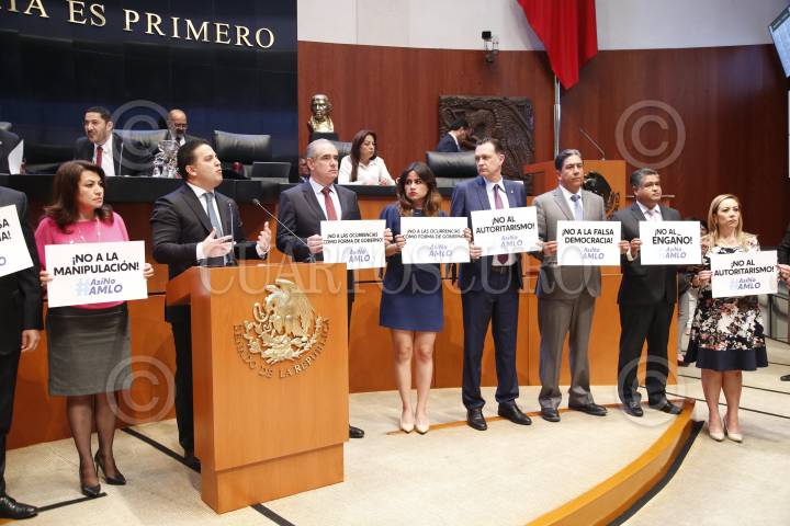 CIUDAD DE MÉXICO, 30OCTUBRE2018.- Los senadores de la bancada del PAN, encabezados por su coordinador Demián Zepeda, se manifestaron durante la sesión contra la cancelación de la construcción del Nuevo Aeropuerto Internacional de México (NAIM) por parte del Presidente de México, Andrés Manuel López Obrador, tras la consulta realizada el fin de semana, los panistas tacharon como falsa el ejercicio ciudadano convocado por el tabasqueño y mostraron pancartas tachándolo de autoritario. FOTO: CUARTOSCURO.COM