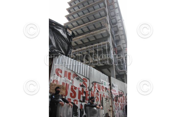 Policía capitalina resguarda la Torre Anzaldo, durante trabajas de demolición. FOTO: ROGELIO MORALES /CUARTOSCURO.COM