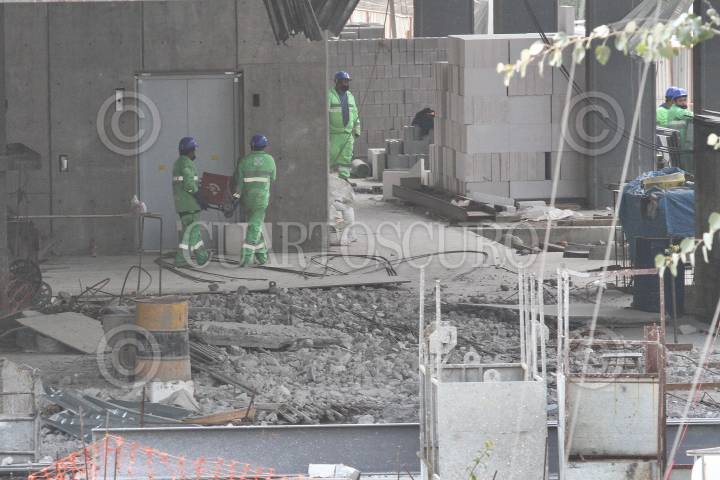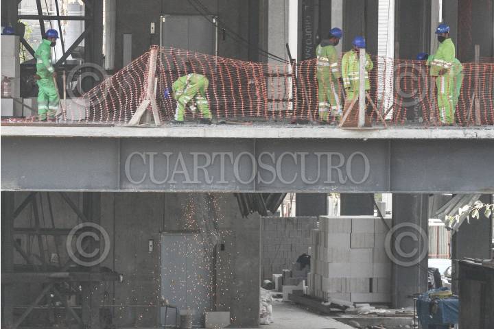 Trabajadores de la construcción se observan en la azotea de lo que fuera el Plaza Condesa en la alcaldía Cuauhtémoc.