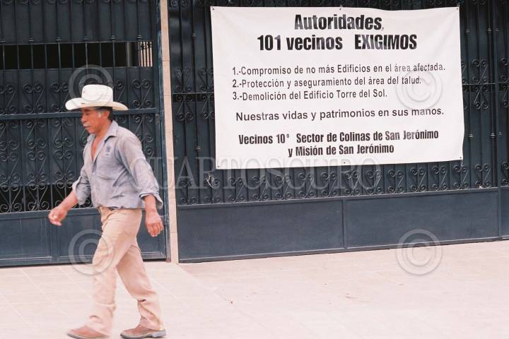 MONTERREY,NL.18.SEPTIEMBRE2005.- Fue colocada una manta en una casa cercana al nuevo Edificio Punta Sol, en la Colonia Jardines de San Jerónimo, que se construyó sobre una grita por una falla geológica y protección civil ordenó la demolición del inmueble ante el peligro de desplomarse. FOTO PEDRO VALTIERRA/CUARTOSCURO.COM