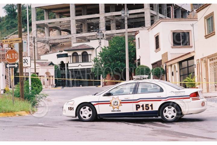 MONTERREY,NL.18SEPTIEMBRE2005.-Policias municipales vigilan la zona donde se encuentra el edificio, al fondo de la imagen, Punta Sol construido sobre una grieta y que afectó a más de 80 familias que fueron desalojadas de sus viviendas en la Colonia Jardines de San Jerónimo. Protección civil ordenó la demolición del inmueble ante el peligro de desplomarse. FOTO: PEDRO VALTIERRA/CUARTOSCURO.COM