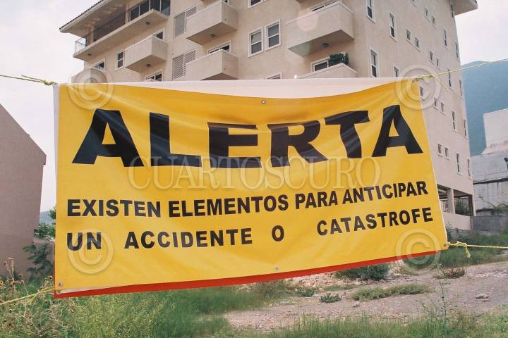 MONTERREY,NL.18SEPTIEMBRE2005.-Proteccion civil coloco letreros de advertencia en la zona cercana al edificio Punta Soi, que será demolido esta semana y que afecto el patrimonio de más de 80 familiares que fuerón desaolojadas de las viviendas e instaladas en Hoteles mientras se resuelve el problema. FOTO PEDRO VALTIERRA/CUARTOSCURO.COM