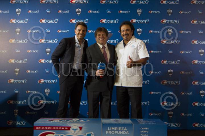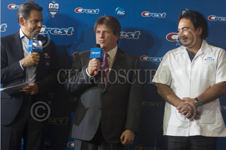MÉXICO, D.F., 29ABRIL2014.- Eugenio Derbez, Miguel Herrera, director técnico de la selección nacional de fútbol y Hugo Sánchez exdierctor técnico de la selección nacional, presentaron la nueva campaña promocional de una conocida pasta dental. FOTO: GUILLERMO PEREA /CUARTOSCURO.COM