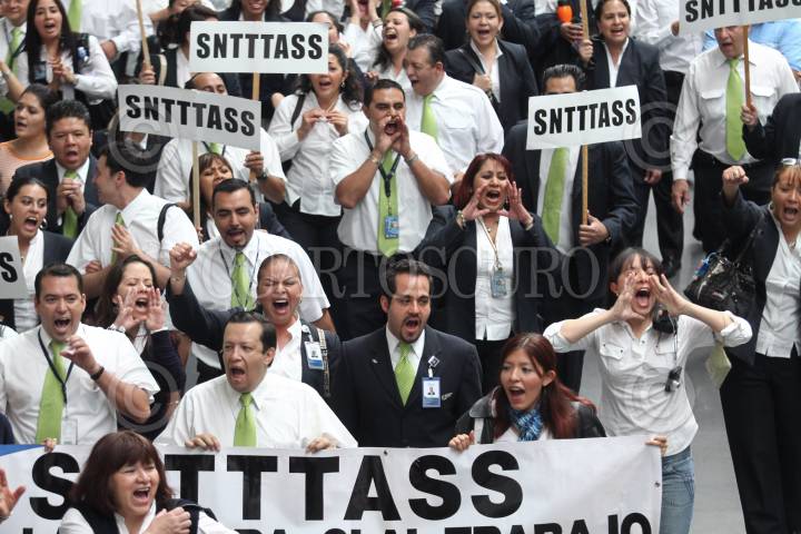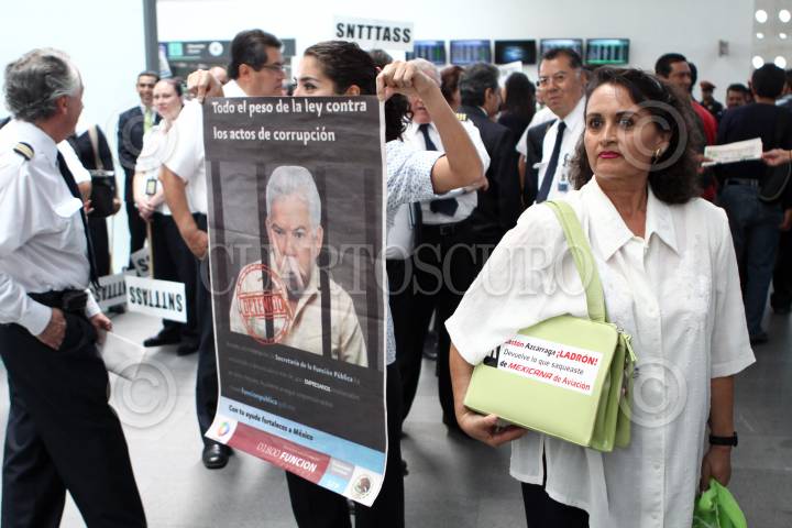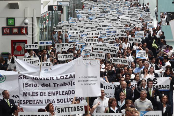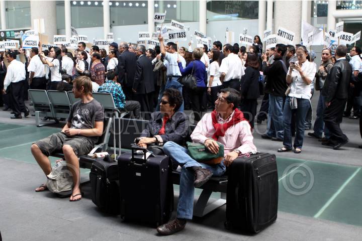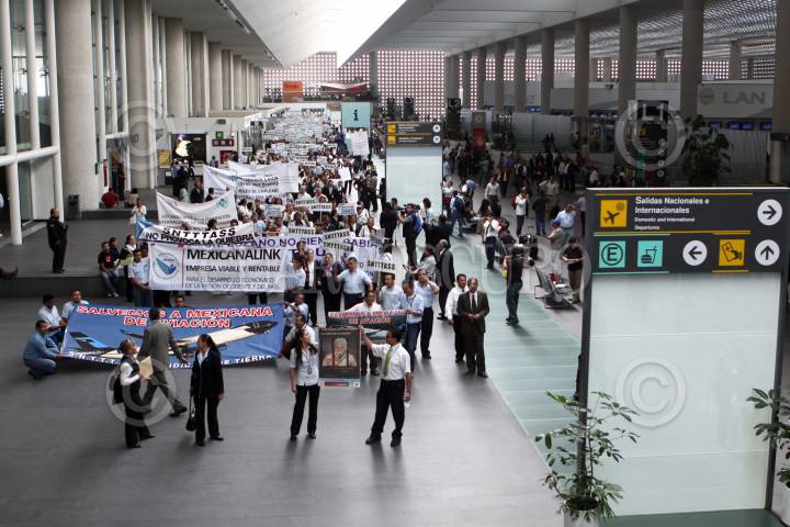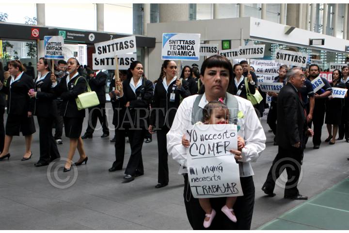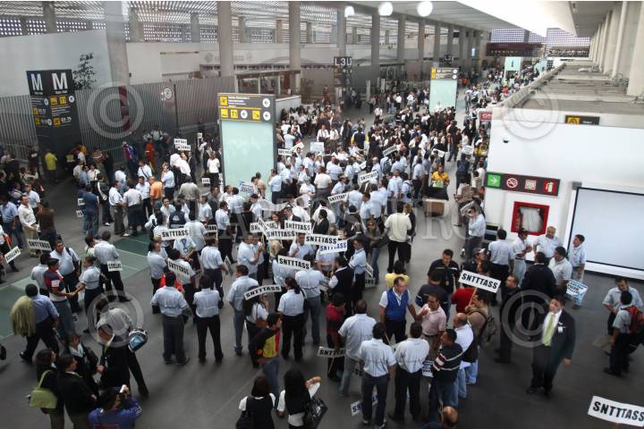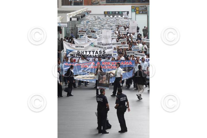 MÉXICO, D.F., 20OCTUBRE2010.- Cientos de sobrecargos, pilotos, y trabajadores de tierra de Mexicana de Aviación marcharon dentro de la Terminal 2 del Aeropuerto capitalino en donde realizaron una protesta ante la crisis económica de la aerolínea en donde demandaron una solución para que se reanuden las actividades lo antes posible. FOTO: RODOLFO ANGULO/CUARTOSCURO.COM