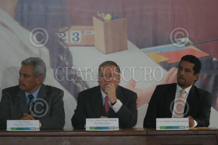 MÉXICO D.F., 09DICIEMBRE2008.- Alberto Cárdenas Secretario de la Sagarpa y Jesús Reyes Heroles, Ruben Orihuela Santos denunciante de un acto de corrupción durante la presentacion del Programa Nacional de Rendición de cuentas , Transparencia y Combate a la corrupción 2008-2012, ceremonia encabezada por Felipe Calderon Presidente de México. FOTO: SÁSHENKA GUTIÉRREZ/CUARTOSCURO.COM