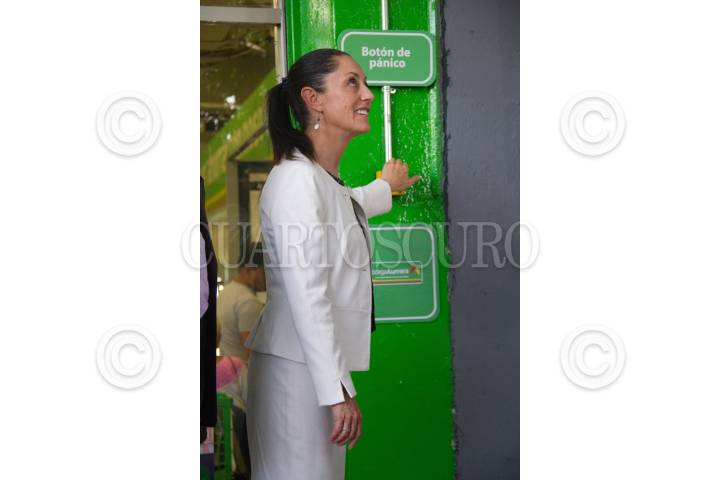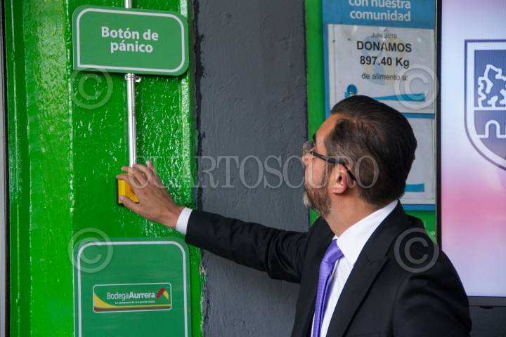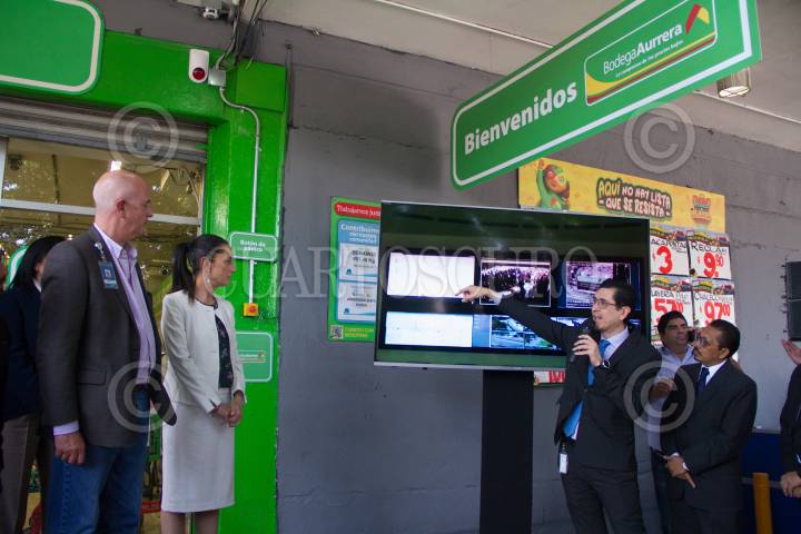 CIUDAD DE MÉXICO, 08AGOSTO2019.- La jefa del Gobierno de la Ciudad, Claudia Sheinbaum Pardo, acudió esta tarde a la Bodega Aurrera Tacubaya, donde presentaron el botón de pánico. Victor Romo, alcalde de Miguel Hidalgo, Jesús Orta, titular de la SSC y Juan Manuel García director del centro de Control y vigilancia C5, acompañaron a la mandataria de la Capital. FOTO: VICTORIA VALTIERRA /CUARTOSCURO.COM