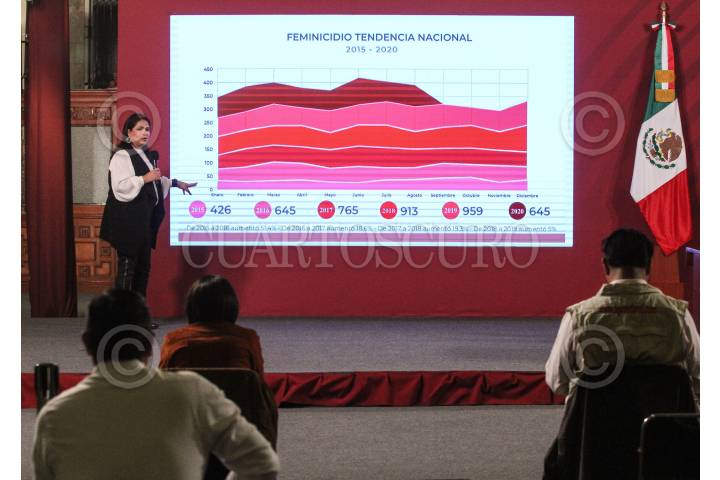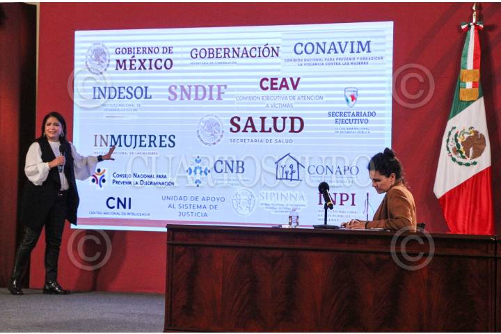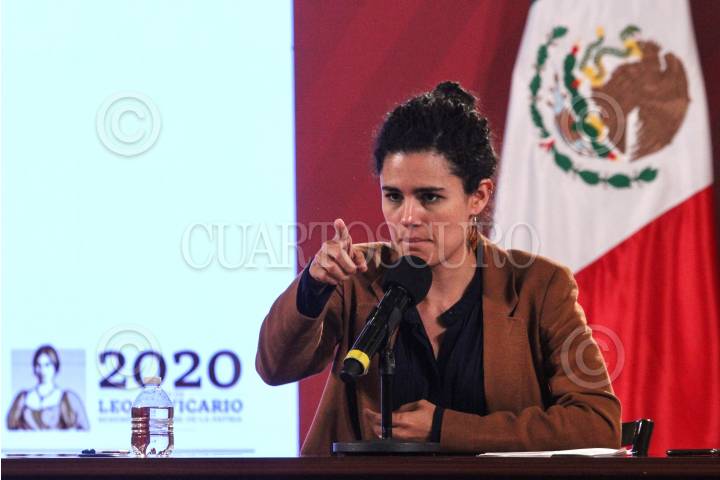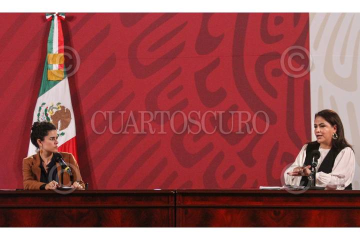 Luisa Maria Alcalde, encabezó la conferencia de Bienestar en el Salón Tesorería de Palacio Nacional. FOTO: ROGELIO MORALES /CUARTOSCURO.COM