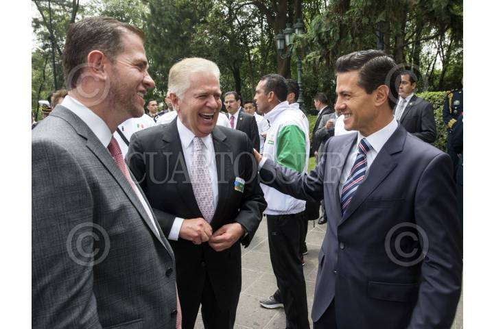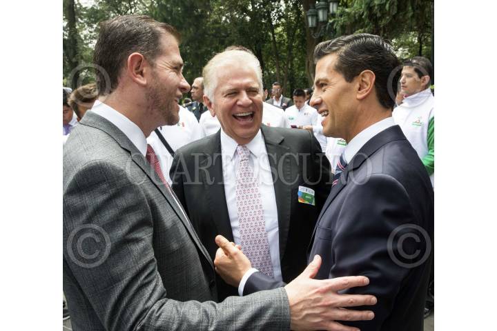 CIUDAD DE MÉXICO, 26AGOSTO2016.- Alfredo Castillo titular de la Conade Carlos Padilla dirigente del Comité Olímpico Mexicano (COM) Y el Presidente Enrique Peña Nieto platican previo al evento de la visita de los medallistas olímpicos de Río de Janeiro 2016. FOTO: PRESIDENCIA /CUARTOSCURO.COM