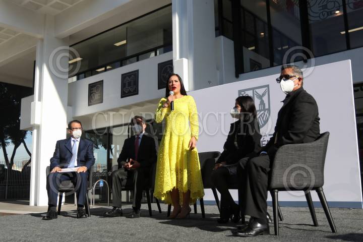 Sandra Cuevas, alcaldesa de Cuauhtémoc, en compañía de los alcaldes: Mauricio Tabe (Miguel Hidalgo); Lía Limón (Álvaro Obregón), y Margarita Zaldaña,(Azcapotzalco), ofreció un discurso para informar sobre su posicionamiento respecto al Deportivo Guelatao.